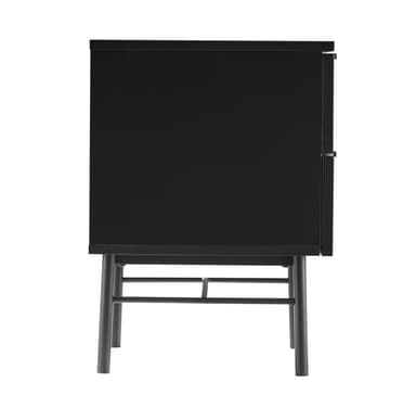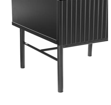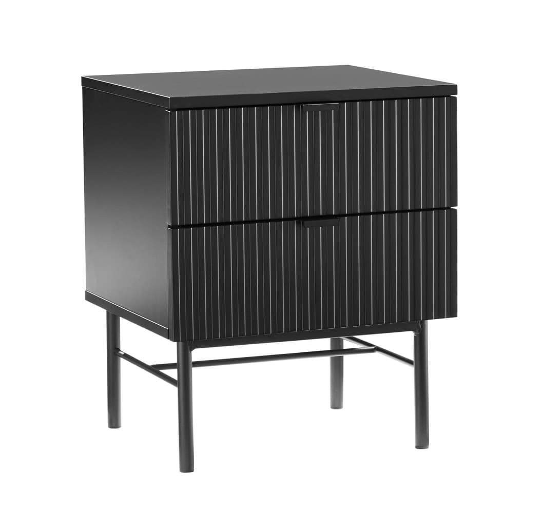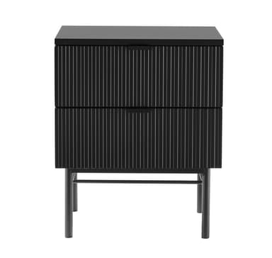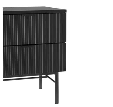 Nattduksbord SEQUENCE med 2 lådor 45x40xH55cm, svart. Nattduksbordets kropp är gjord av MDF-skiva. Skåpet har randiga lådfronter med präglad yta och metallhandtag. Lådorna rör sig på metallskenor. Nattduksbordet är avslutat med slitstark polyuretanfärg. Metallbasramen och benen är färdiga med pulverfärg.