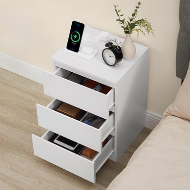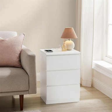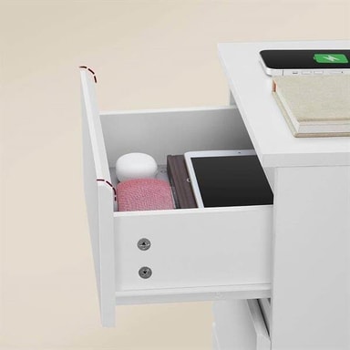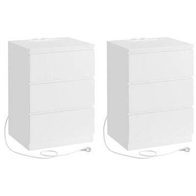 Specifikation - Mått per bord: ca 40 x 35 x 55 cm (B x D x H) - Material: MDF, spånskiva (15 mm tjocklek) - Funktion: 2 AC-uttag, 2 USB-portar, 2 m kabel - Lådor: 3 per bord, med snedskurna kanter - Utförande: Handtagsfri vit design - Leverans: 2-pack