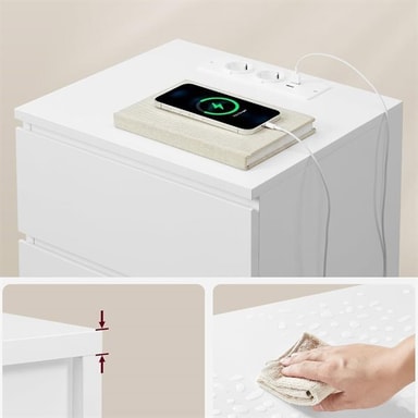 Detta set med två vita sängbord erbjuder både smart laddningsmöjlighet och rymlig förvaring. Med integrerad strömlist som innehåller två eluttag, två USB-portar och en 2 meter lång kabel, blir det enkelt att ladda både mobil, surfplatta, laptop och sänglampa direkt från sängen – helt utan att behöva sträcka sig till väggen.