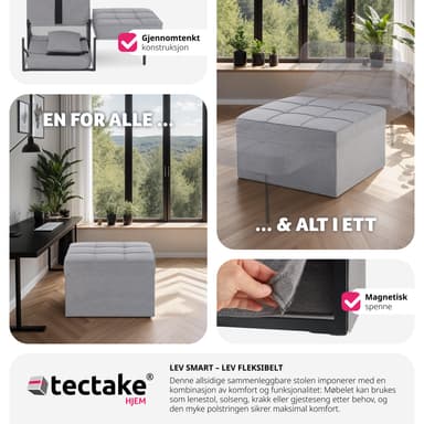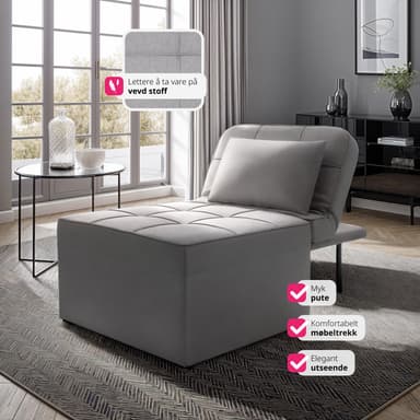 Den supertjocka skumstoppningen av högdensitetsskum, det mjuka vävtyget och den mjuka huvudkudden ger maximal komfort. Tack vare den innovativa 4 i 1-funktionen och det justerbara ryggstödet hittar du alltid den perfekta sitt- eller liggpositionen. Oavsett om det är som fåtölj, platsbesparande pall, praktisk schäslong eller bekväm fåtölj så kan du tack vare den smarta fällfunktionen hitta en lösning som passar dina behov.