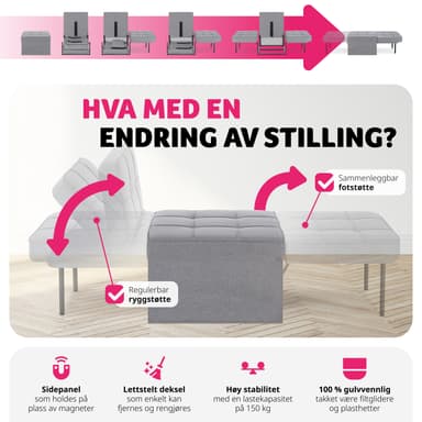 Den robusta och pulverlackerade stålramen imponerar med en hög belastningskapacitet och säkerställer en pålitlig stabilitet i alla positioner. De golvskonande filtkuddarna på ramen och de halkfria möbeltassarna i plast ger utmärkt stabilitet på alla typer av underlag. Dessutom gör de avtagbara och tvättbara överdragen rengöringen av denna mångsidiga möbel både snabb och enkel.