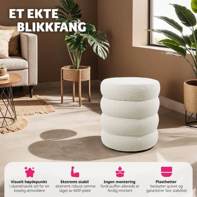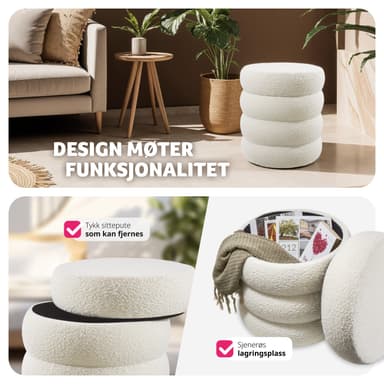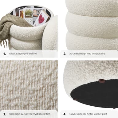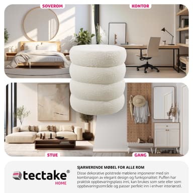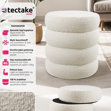 Upplev exklusiv design och hög funktionalitet med sittpuffen Altu från tectake. Denna dekorativa puff i mjukt bouclé-tyg imponerar med sin inbjudande charm och skapar en varm och hemtrevlig atmosfär i ditt hem. Sittpallen är inte bara en visuell höjdpunkt utan erbjuder också mycket praktiska fördelar. Under det avtagbara locket på sittpuffen finns ett rymligt förvaringsutrymme där du enkelt kan förvara filtar, kuddar eller böcker. Allt får sin plats här och är alltid lättillgängligt. Pallens mjuka vaddering av skumgummi erbjuder en bekväm sittupplevelse, medan den höga stabiliteten säkerställer en utmärkt bärförmåga.