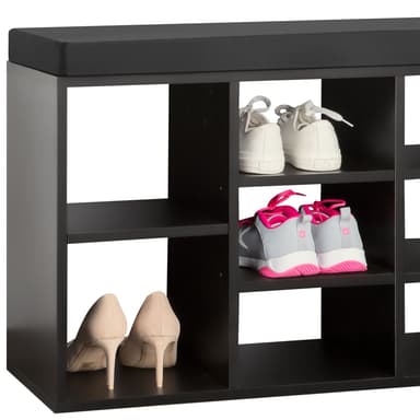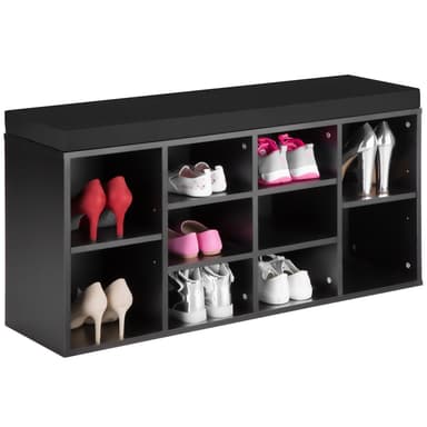 Vår härliga skohylla väntar på att få komma till användning hos dig. På skobänken har du den bekväma sittdynan som ger dig ytterligare en sittplats. Överdraget på sittdynan är avtagbart och går därför lätt och snabbt att rengöra. Om du väljer att använda den mångsidiga hyllan som skohylla kommer det att finns utrymme för upp till 10 par skor. Skohyllan har två sidofack som är justerbara och ger utrymme till dina stövlar. Facken i mitten är fast monterade. Oavsett om det står i hallen, barnkammaren, köket eller garderoben – kommer du att ha mycket glädje av den fina skohyllan från tectake.