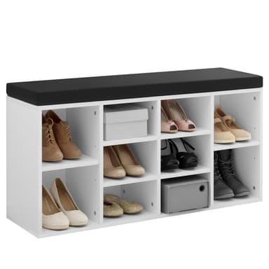 Vår härliga skohylla väntar på att få komma till användning hos dig. På skobänken har du den bekväma sittdynan som ger dig ytterligare en sittplats. Överdraget på sittdynan är avtagbart och går därför lätt och snabbt att rengöra. Om du väljer att använda den mångsidiga hyllan som skohylla kommer det att finns utrymme för upp till 10 par skor. Skohyllan har två sidofack som är justerbara och ger utrymme till dina stövlar. Facken i mitten är fast monterade. Oavsett om det står i hallen, barnkammaren, köket eller garderoben – kommer du att ha mycket glädje av den fina skohyllan från tectake.