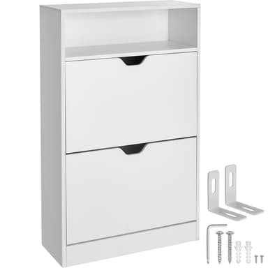 Den öppna hyllan ovanför de fällbara lådorna är perfekt för nycklar, plånböcker, halsdukar eller mössor. Grepphålen på framsidorna ger bra ventilation och framhäver dessutom den moderna designen av skoskåpet. Tack vare den höga belastningskapaciteten och de medföljande vinkelbeslagen för säker tippningsskydd står skoskåpet stabilt och pålitligt, även vid full belastning.