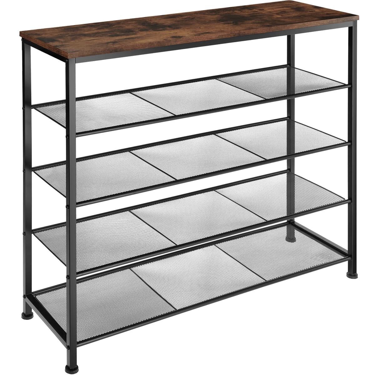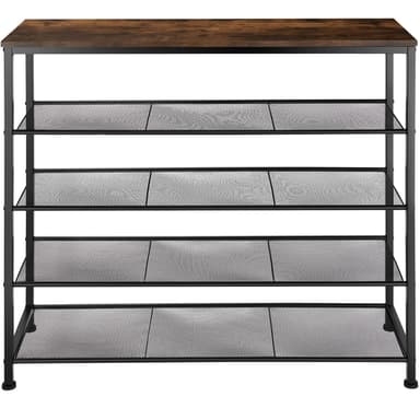 Det smala Sheffield skoställsskåpet från tectake erbjuder generöst förvaringsutrymme på fyra nivåer. Designat i den trendiga industriella stilen, med en kombination av trä och stål, förenar den lättskötta konstruktionen praktiska funktioner med en stilren look som passar perfekt i ditt hem. Med generös höjd mellan hyllorna får du enkelt plats för skor, träningsskor, pumps, tofflor och mer på de tre tätmaskiga gallerhyllorna, vilket gör dem lätta att komma åt. Den robusta ramen i pulverlackerat stål och de justerbara skruvfötterna garanterar hög stabilitet, vilket gör skostället till ett idealiskt val för förvaring i hallen eller på kontoret. Ge din entré en ordentlig uppfräschning med det charmiga Sheffield skostället från tectake.