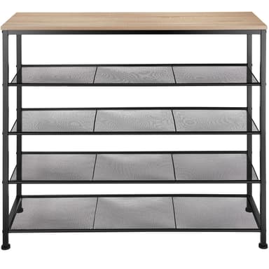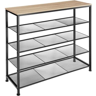 Det smala Sheffield skoställsskåpet från tectake erbjuder generöst förvaringsutrymme på fyra nivåer. Designat i den trendiga industriella stilen, med en kombination av trä och stål, förenar den lättskötta konstruktionen praktiska funktioner med en stilren look som passar perfekt i ditt hem. Med generös höjd mellan hyllorna får du enkelt plats för skor, träningsskor, pumps, tofflor och mer på de tre tätmaskiga gallerhyllorna, vilket gör dem lätta att komma åt. Den robusta ramen i pulverlackerat stål och de justerbara skruvfötterna garanterar hög stabilitet, vilket gör skostället till ett idealiskt val för förvaring i hallen eller på kontoret. Ge din entré en ordentlig uppfräschning med det charmiga Sheffield skostället från tectake.