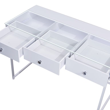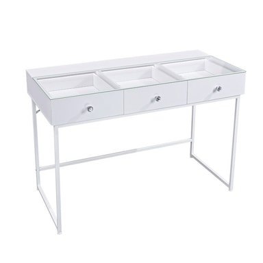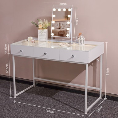 Bordet mäter 115 cm (L) × 55 cm (B) × 81 cm (H), är ergonomiskt designat i högkvalitetsplatta och härdat glas för stabilitet och hållbarhet. Den snygga vita utseenden passar in i alla inredningsstilar och erbjuder god lagringsplats för alla dina kosmetika.