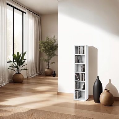 Denna stilrena CD-hylla med plats för 102 CD-skivor är en given möbel för ditt hem. Med hjälp av denna snygga CD-ställ får du ordning på din DVD och CD-samling, så behöver inte samlingen ligga bortgömd längre. CD-förvaringen har fem hyllor som kan placeras utifrån dina egna önskemål. Med sitt stiliga utseende och många hyllplan är den smala hyllan även perfekt för att förvara och ställa upp andra dekorationer.