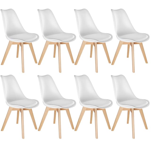 Dessa matstolar i 8-set kombinerar ett elegant utseende med en diskret färgsättning. Inspirerade av skandinavisk design, erbjuder de både stil och komfort. Den svängda formen på sittdynan och den tjocka vadderingen ger en behaglig sittupplevelse. Stolarna har stabila ben i slitstarkt trä som ger hög belastningskapacitet och lång hållbarhet. Smuts och fläckar kan enkelt torkas bort med en fuktig trasa, vilket ger dig mer tid att njuta av dessa trendiga matstolar från tectake.