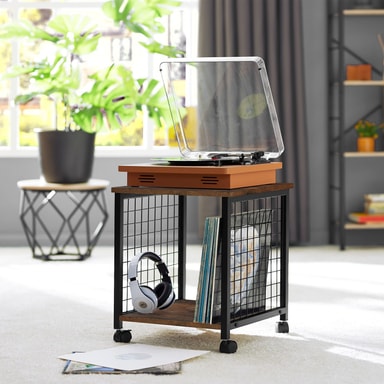 Det mobila sidobord Gary från tectake poängsätter både med sitt trendiga utseende och sina praktiska användningsområden. Sidobordets svarta stålramen ger en cool kontrast till de lättare spånskivorna i en varm trälook och identifierar denna kantiga möbel som en typisk representant för den minimalistiska industristilen. Sidogallerna ger den kubformade konstruktionen dess speciella touch och förstärker den grova fabrikskänslan. Tack vare de fyra mjuktgående hjulen med parkeringsbroms är de två hyllorna på det lättskötta sidobordet alltid inom räckhåll - perfekt för läckra snacks och kalla drycker på en mysig kväll.