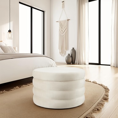 Sittpuffen med förvaring är tillverkad av en solid MDF-skiva och utmärker sig med sin höga stabilitet och belastningskapacitet. Puffens undersida är försedd med skonsamma och halkfria möbeltassar som säkerställer en hög stabilitet på alla golv.