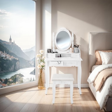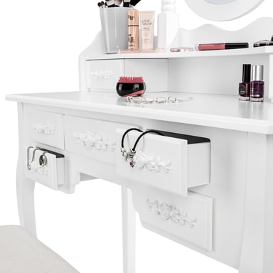Vårt romantiska sminkbord är en riktig pärla som erbjuder gott om utrymme. De sju rymliga byrålådorna ger dig mycket plats för smink, och det rymliga sminkbordet tillsammans med speglarna ger en perfekt lösning för all din sminkförvaring. Varje byrålåda och den bekväma, vadderade pallen är prydda med vackra rosornament, vilket gör sminkbordet till en verklig höjdpunkt i ditt rum. Den flexibla 360°-vridbara ovalspegeln, tillsammans med två extra sidospeglar, gör det enkelt att skapa alla typer av frisyrer och makeup. Den vita trälackeringen på både bord och pall skapar en perfekt harmoni och förstärker det vackra utseendet. Utforska vårt sortiment av sminkförvaring, sminkbord med spegel, sminkspeglar, och andra förvaringslösningar för din makeup och skönhet.