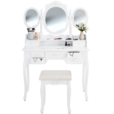 • tectake Sminkbord med 7 byrålådor, med sminkspegel och pall 90 x 40 x 145 cm Vit