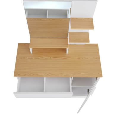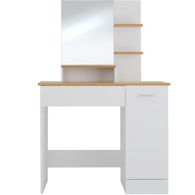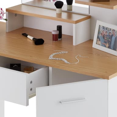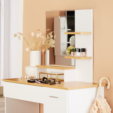 Vid sminkbord Zoe från tectake blir styling ett rent nöje. Sminkning och frisyrer kan ordnas med perfekt resultat framför den stora spegeln. Melaminbeläggningen ger den robusta spånskivkonstruktionen en lättskött och reptålig yta. Med sin raka design passar sminkbord Zoe in i alla miljöer och skapar en stilren siluett i vilket rum som helst.