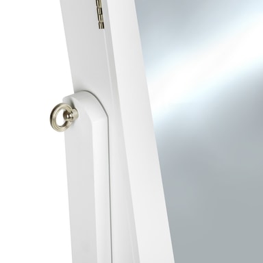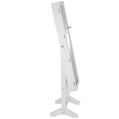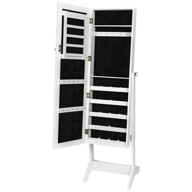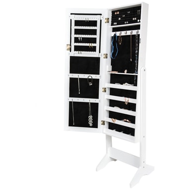Med vårt vackra spegelskåp kan smycken och accessoarer utan problem förvaras översiktligt och dammfritt. Detta smyckesskåp utmärker sig framförallt genom den högkvalitativa tillverkningen och genom känslan för detaljer. Detta smyckesskåp kan du ha stående i ditt badrum, sovrum eller klädkammare. På smyckeshängarens krokar kan kedjor, ringar, örhängen och armbandsur förvaras översiktligt ordnade och lätta att sortera. Skåpets spegel kan svängas och fixeras i 3 olika lägen och på så sätt kan den anpassas optimalt efter behov och kroppslängd. Få en smart förvaring för dina smycken, beställ hem detta stilrena smyckesskåp.