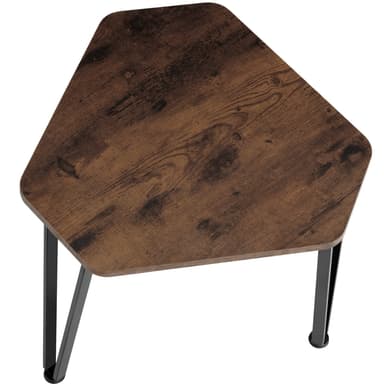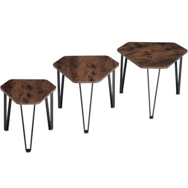 Gör modestatement i ditt hem i en distinkt industriell stil med det tredelade soffbordsset Torquay från tectake. Soffbordets chica materialblandningen av svalt stål och varmt trä bildar en spännande kontrast som frammanar en stämning som är lika grov som inbjudande i varje rum. De bordsskivorna med sina fina fibrer skapar charmiga förvaringsutrymmen för drycker, läsmaterial eller en delikat lampa bredvid soffan, fåtöljen och sängen. Trots sina filigranliknande bågar imponerar de charmiga allroundarna med sin höga nivå av stabilitet och spänst - den perfekta trion för sociala pauser.