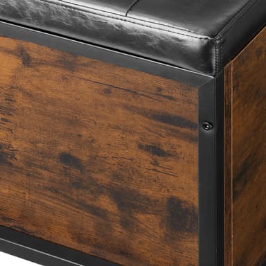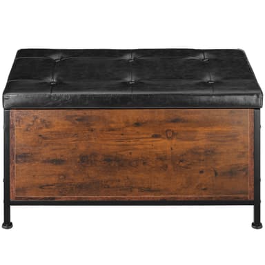 Med den snygga förvaringsbänken Calico-pallen från tectake får du en charmig sittmöbel med ett trendigt industriellt utseende. Sittbänkens vadderade lock är klätt i slitstarkt konstläder med tygveck och knappar, vilket harmoniserar perfekt med bänkens varma trä och svala stål. Med sitt rymliga förvaringsutrymme är denna vadderade sittbänk ett utmärkt extra förvaringsalternativ i hallen, sovrummet eller vardagsrummet. Förvaringsbänkens kompakta design vilar på robusta och justerbara fötter som säkerställer en hög stabilitet och kompenserar för ojämnheter, oavsett var du placerar den.