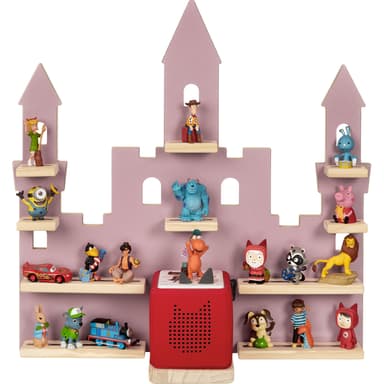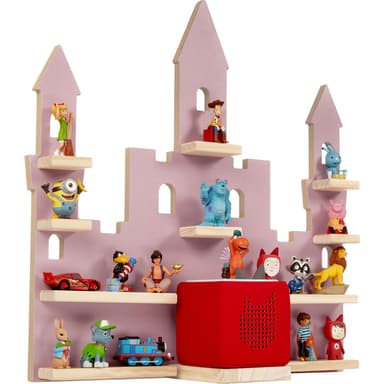 En annan fördel är det praktiska podiet för en Toniebox, som inte bara ger en stabil plats för enheten utan också har en genomtänkt laddstation med integrerad kabeldragning. Därmed erbjuder barnhyllan inte bara plats för att förvara figurerna själva, utan skapar en smart helhetslösning där du alltid har alla tillbehör på plats.