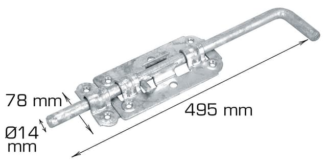 Mål: L495 x B78 x Ø14 mm Inkl. skruer Materiale: Galv. Kan monteres med en 10 mm hengelås.