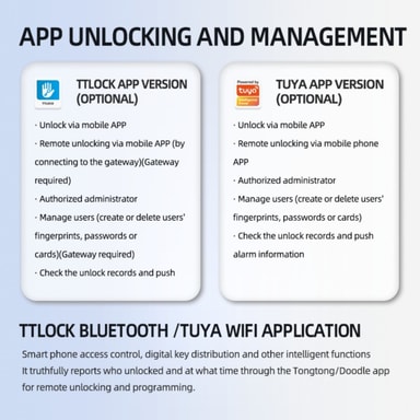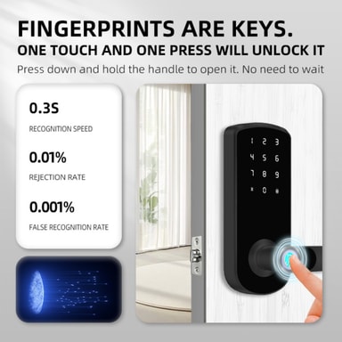 Mångsidiga upplåsningsmetoder: Upplev oöverträffad bekvämlighet med vårt smarta dörrlås mångsidiga upplåsningsalternativ. Lås enkelt upp din dörr med TTLock Bluetooth-appen, ditt unika fingeravtryck via den avancerade halvledarsensorn, ett säkert lösenord, NFC-teknik, ett fysiskt kort, en traditionell nyckel eller till och med ett tillfälligt lösenord för gäster. Denna flexibilitet säkerställer enkel åtkomst för dig och auktoriserade personer, vilket ger trygghet och eliminerar besväret med traditionella nycklar. Perfekt för familjer, uthyrning och företag som söker förbättrad säkerhet och bekvämlighet. Fingeravtrycksigenkänningen är snabb och exakt, vilket säkerställer att endast behöriga användare får tillträde. Njut av nyckelfri ingång och avancerade säkerhetsfunktioner med detta innovativa smarta lås.