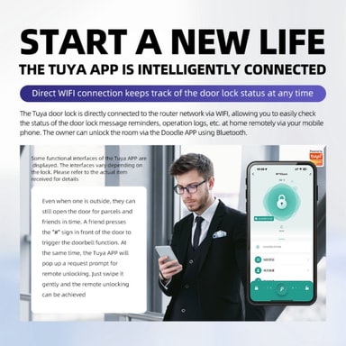 Fjärråtkomst via Tuya-appen: Få fullständig kontroll över din hemsäkerhet med Tuya WiFi Smart Dörrlås. Detta smarta lås låter dig fjärrövervaka och hantera åtkomst till din egendom via Tuya-appen. Oavsett om du är på jobbet, reser eller helt enkelt är borta från hemmet kan du ge tillfälliga åtkomstkoder till gäster, leveranspersonal eller tjänsteleverantörer. Få realtidsaviseringar när dörren låses eller låses upp, vilket säkerställer att du alltid är medveten om vem som går in och ut ur ditt hem. Fjärråtkomstfunktionen ger oöverträffad bekvämlighet och sinnesfrid, vilket gör den till ett viktigt tillägg till alla moderna smarta hemsäkerhetssystem. Detta Tuya smarta lås är kompatibelt med olika dörrtyper och erbjuder en sömlös integration i din befintliga installation.