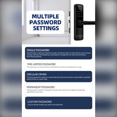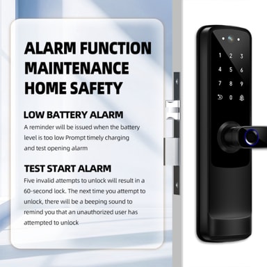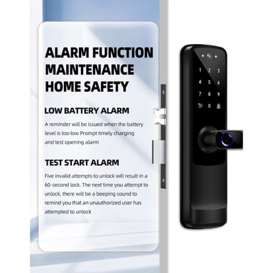Flera upplåsningsmetoder: Upplev ultimat flexibilitet med Tuya WiFi Smart Dörrlåsets flera upplåsningsmetoder. Välj mellan fingeravtrycksigenkänning, lösenordsinmatning, RFID-kortåtkomst eller traditionell nyckelupplåsning, vilket tillgodoser din föredragna inmatningsmetod. Den högprecisions fingeravtryckssensorn säkerställer snabb och exakt identifiering, medan den anpassningsbara lösenordsfunktionen låter dig skapa unika koder för olika användare. De medföljande RFID-korten ger ett bekvämt alternativ för familjemedlemmar eller gäster. I händelse av nödsituationer eller bortglömda koder erbjuder det traditionella nyckelupplåsningsalternativet en pålitlig reservlösning. Detta mångsidiga smarta lås anpassar sig till din livsstil och ger en sömlös och säker inmatningsupplevelse varje gång. Tuya WiFi Smart Dörrlås är designat för enkel installation och användarvänlig drift.