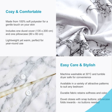 Setet innehåller ett påslakan (135x200 cm) och ett örngott (80x80 cm). Det är perfekt för hemmet, hotell och vandrarhem.