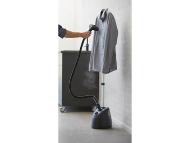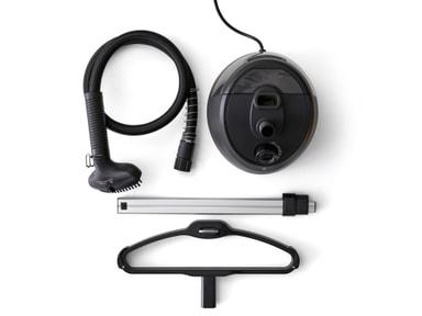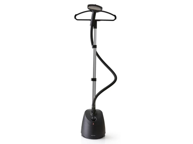 Steamer med 1,4 liters invändig vattentank som ger ca 40 minuters ånga. Klar på 45 sekunder. 3 ånginställningar och automatisk avstängning när vattnet är för varmt eller om tanken är tom. Inklusive tygborste och hängare