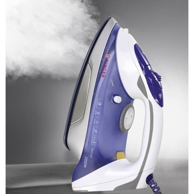Singer SNG 5.22 Ångstrykjärn Blåvit 2200 WVertikal ånga: Kläder kan bekvämt stryk på en galge Självrengöring med en knapptryckning: Inuti sulan, avlägsnar smuts och avlagringar Avkalkningssystem Öppen bygelspets: ideal för skjortfickor-/bluseknappar