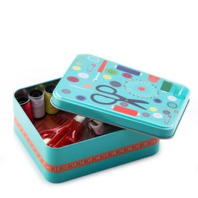 Vi presenterar en praktisk och originell liten sylåda i metall med tillbehör! Perfekt för små reparationer och arrangemang av tyger och material.