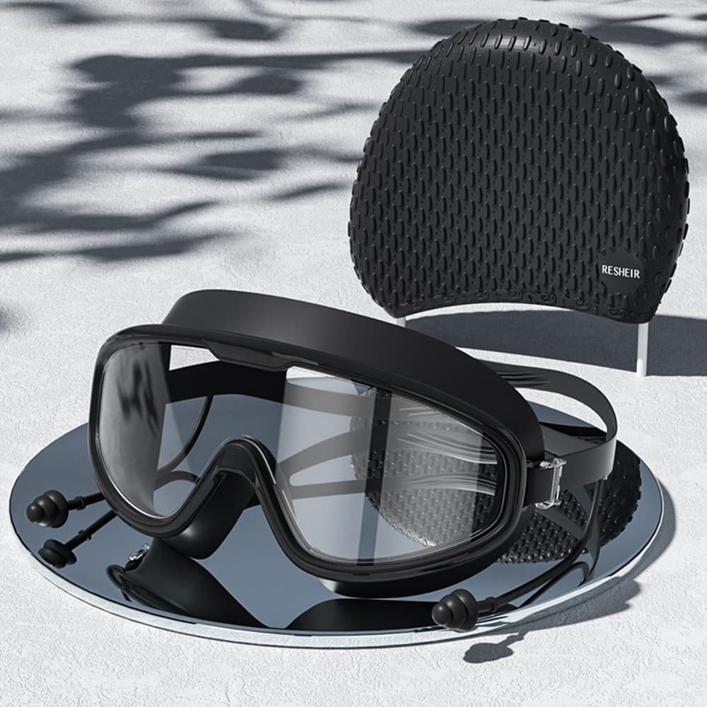【Komplett set】Innehåller simglasögon med stora bågar och en badmössa med vattendroppstextur i ett paket.