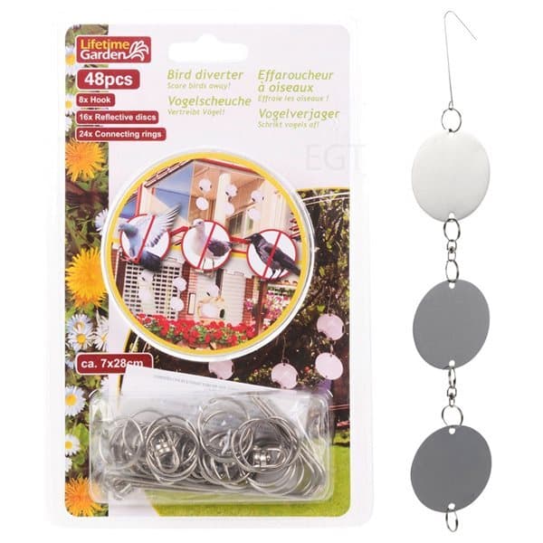 Håll din trädgård, balkong eller uteplats ren från oönskade fågelgäster med denna effektiva fågelskrämma. Istället för ljud eller skadliga kemikalier, använder den reflekterande skivor för att skapa bländande ljus som avskräcker fåglar. Perfekt för att skydda dina växter, fruktträd eller andra ytor som ofta blir måltavlor för hungriga eller nyfikna fåglar.
