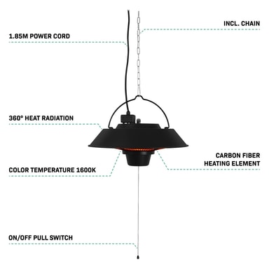 VONROC Ustica är en elegant och effektiv hängande infravärmare som ger direkt värme på bara 3 sekunder. Med sin kraftfulla 1500W kolfiberlampa skapar den en varm och mysig atmosfär på altanen, under pergolan, i uterummet eller på den inglasade balkongen. Tack vare IP44-klassningen är den damm- och stänkskyddad, vilket gör den idealisk för skyddade utomhusmiljöer.