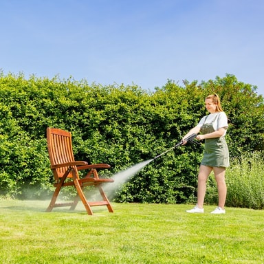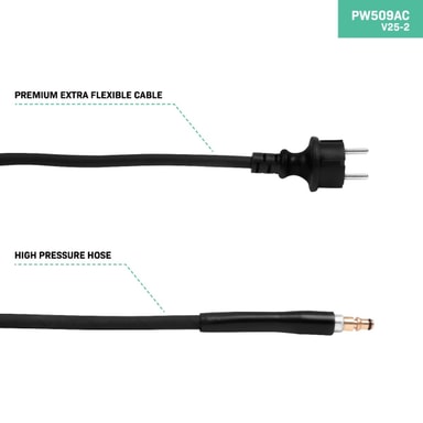 Den hållbara motorn förhindrar slitage av de inre delarna och gör den här högtryckstvättmaskinen lämplig för långvarig användning. Den 8 meter långa förstärkta ståltrådsflexibla slangen och den 5 meter långa sladden ger stor rörelsefrihet.