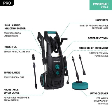 Den här kraftfulla VONROC högtryckstvätten PRO är redo för alla rengöringsjobb. Den hållbara induktionsmotorn kommer inte att svika dig. Från känslig rengöring till kraftfull hårdare rengöring! Stor rörelsefrihet ges tack vare den 8 meter långa slangen och den 5 meter långa sladden. Med medföljande slangrulle för enkel och snygg förvaring.