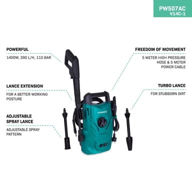 Denna 1400W VONROC högtryckstvätt sprutar vatten med ett tryck på upp till 110 bar och med ett maximalt vattenflöde på 390 liter per timme. Denna modell levereras inklusive en 5m lång högtrycksslang, en sprutpistol, ett justerbart munstycke, ett turbomunstycke, en lansförlängning, en trädgårdsslanganslutning med vattenfilter och en rengöringsnål. Du kan alltså börja arbeta direkt efter leverans!