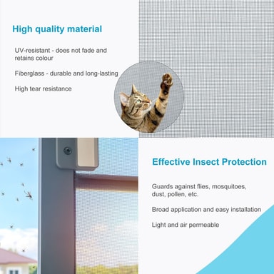 Vårt flamskyddade flugnät av högkvalitativ glasfiber ger dig - jämfört med andra material - en långvarig användning på dina dörrar och fönster. Tack vare den UV-beständiga glasfibern bleknar nätet inte och behåller sin rivstyrka. Den höga rivhållfastheten förhindrar också att nätets ändar slits sönder. Det skyddande nätet håller insekter och annan miljöpåverkan som pollen och damm ute. Beroende på omständigheterna kan det fästas med klämma, kardborreband, självhäftande remsor eller dubbelhäftande tejp. Denna produkt säljs per meter, dvs. 1 order = 1 meter. Maskstorlek 1,2 mm.