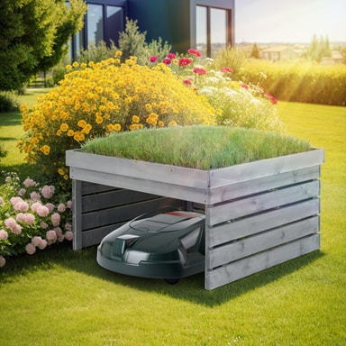 Den väderbeständiga ramen är tillverkad av hållbara och betsade tallträslister och kan användas universellt för många robotmodeller. Det ger din självgående gräsklippare ett säkert tak och skyddar pålitligt mot regn,hagel och solljus.
