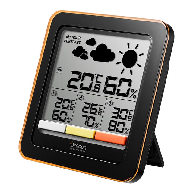 Oregon scientific rar502x multi-zone home climate control wireless weather station med lcd-skärm gör att du enkelt kan övervaka temperaturen och fuktigheten i upp till fyra områden i ditt hus. Visa enkelt temperatur- och luftfuktighetsdata i olika områden i ditt hem på den stora lcd-skärmen. Den innehåller en formvarningsikonfunktion och den visar väderprognosen för de kommande 12-24 timmarna.
