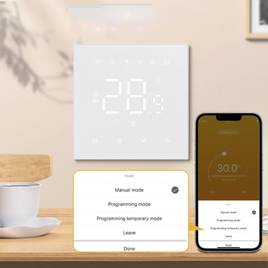 Flera Lägen: Denna termostat erbjuder en mängd olika lägen för att passa din livsstil. Välj mellan manuellt läge för direkta temperaturjusteringar, programmeringsläge för att ställa in veckovisa värmescheman, tillfälligt programmeringsläge för att åsidosätta schemat vid behov och bortläge för energibesparing när du är ute. Flexibiliteten i dessa lägen säkerställer att ditt värmesystem alltid är optimerat för din komfort och energieffektivitet. Växla enkelt mellan lägen via appen eller termostatens intuitiva gränssnitt.