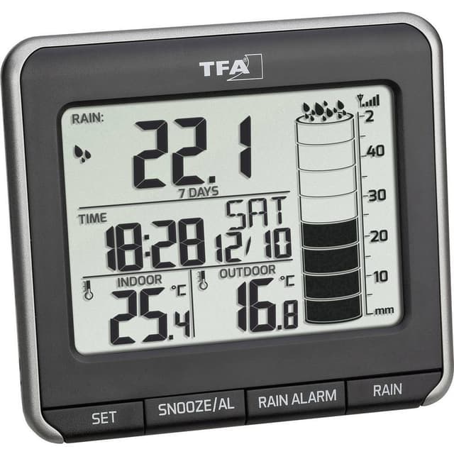 TFA Dostmann 47.3004.01 Trådlös regnmätareTrådlös överföring av utomhustemperatur och regnmängd · Aktuell visning och grafisk visning av regnmängd, totalt, den senaste timmen, de senaste 24 timmarna, de senaste 7 dagarna och den senaste månaden ·
