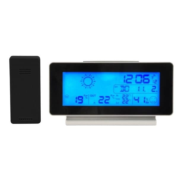 Day Väderstation Trådlös Trådlös väderstation med LCD-skärm. Väderstationen använder 2x1.5v AAA-batterier (ingår ej.). Trådlös sändare använder 2x1,5 v AAA (ingår ej.) Räckvidd (obegränsad): 60 m. Temperaturområde in / ut: 0-50 grader. Temperaturområde ut: -20-60 grader. Temperaturenhet: C/F. Funktioner: Inomhus / utomhusmätare, aktuell min / max temperatur, väder symboler, hygrometer, radiostyrd klocka med klockslag , veckodagar på 7 språk, datum och alarm med snoozefunktion. LCD-display med bakgrundsbelysning. Med väggbeslag och fot. Storlek: - Väderstation 8,6x6,6x3,9cm - Sändare 9,2x4x2,5cm