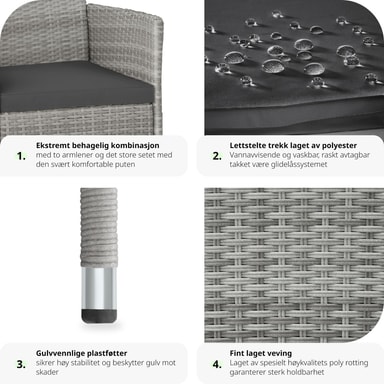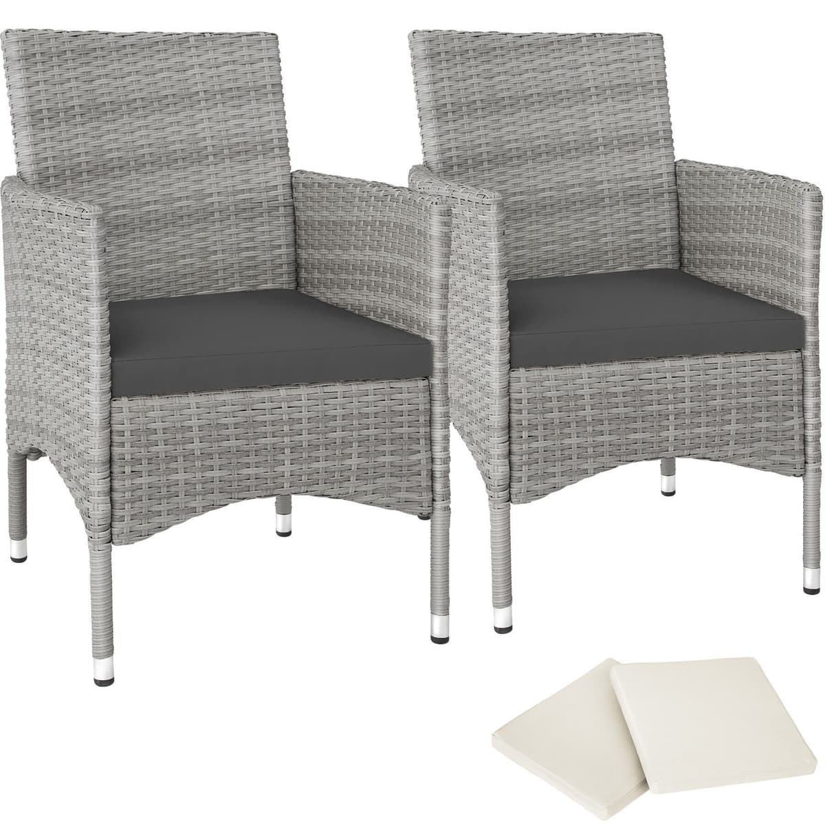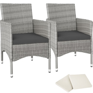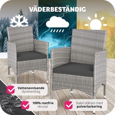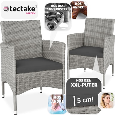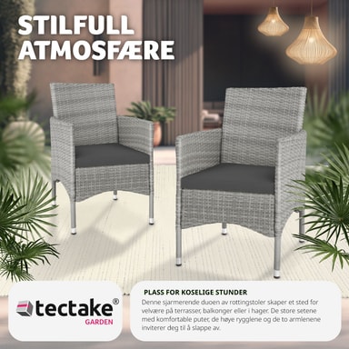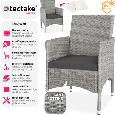 De eleganta rottingträdgårdsstolarna Royan från tectake är designade för härliga stunder med trevliga samtal utomhus. Den robusta stålkonstruktionen och den stilrena konstrottingväven skapar en perfekt kombination av stabilitet och elegans. Trädgårdsstolarna är utrustade med bekväma sittdynor och fyra vattenavvisande, utbytbara överdrag i två färger, vilket ger både komfort och flexibilitet.