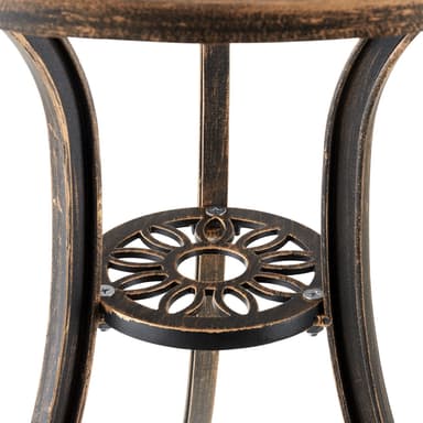 Tack vare cafésetets tillverkning i väderbeständig aluminium är det hållbart och perfekt för din uteplats. Trädgårdsmöbeln utmärker sig samtidigt med en förstklassig stabilitet och god belastningskapacitet. Trädgårdsstolarna är dessutom utrustade med höjdjusterbara plastfötter som smidigt kompenserar för ojämnheter i underlaget.