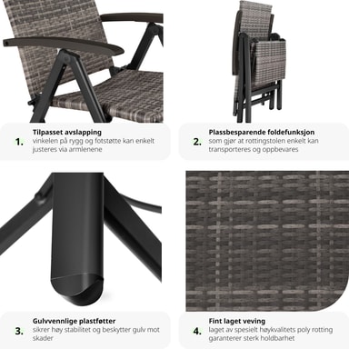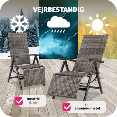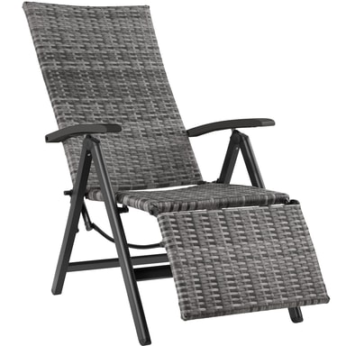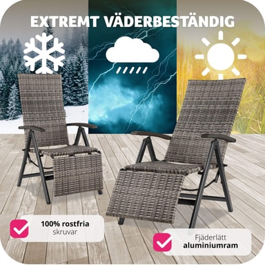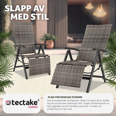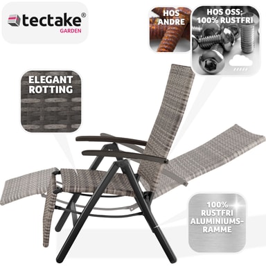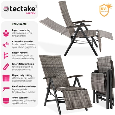 Letar du efter en positionsstol med fotstöd? Med denna komfortabla solstol från tectake får ditt letande ett lyckligt slut. Trädgårdsstolen är hopfällbar och justerbar, så att den enkelt går att anpassa efter egna sitt- och liggpreferenser. Positionsstolen med fotstöd övertygar inte minst genom sin tidlösa, attraktiva design som utgörs lika mycket av polyrotting-utseendet och aluminiumställningen som praktiska extrafunktioner, till exempel arm- och fotstöden. Denna positionsstol är lämplig för att brukas både inom och utomhus.