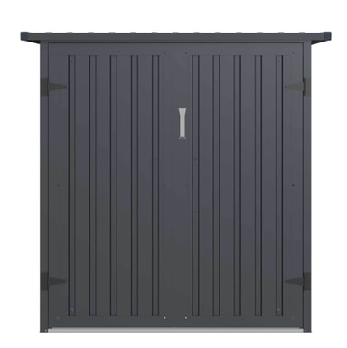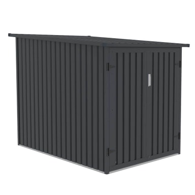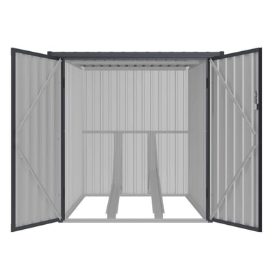 Det här cykelförvaringsskjulet har lättanvända förvaringsställ för två cyklar. Ett säkerhetslås ser till att dina cyklar alltid är säkra. Cykelgaragets mörkgrå färg passar perfekt i alla miljöer. Detta cykelförråd för två cyklar mäter 142 cm långt, 157 cm högt och 198 cm brett.
