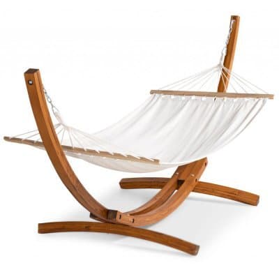 Avnjut obesvärad avkoppling i en följsam, ljusbeige/off-white hängmatta av polyester och bomull, som vilar på en kraftig träställning.