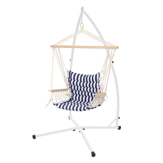 Fåtöljen med bekväma armstöd är tillverkad av robust bomull och högkvalitativt trä och är ett riktigt blickfång på uteplatsen, i huset eller i trädgården. Den är snabb och enkel att fästa, så den kan placeras nästan var som helst. Tack vare den lilla volymen kan du också förvara den snabbt och platsbesparande när som helst.