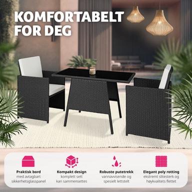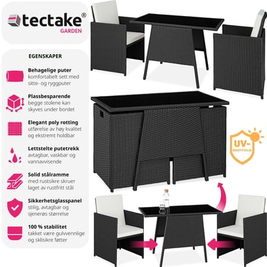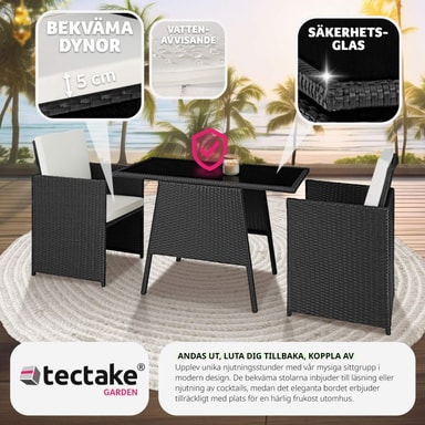 Denna kompakta matgrupp i konstrotting från tectake är perfekt för uteplatser med mindre utrymme. Trädgårdsmöbeln är funktionellt designad utan att kompromissa med komfort och stil. Den flätade konstrottingen har en elegant struktur, medan ramen är byggd av robust och pulverlackerat stål för hög hållbarhet och stabilitet. Utemöblernas kompakta design gör att de separata elementen kan enkelt skjutas ihop och förvaras platsbesparande. Trädgårdsmöbelns fåtöljer erbjuder hög komfort, med mjuka dynor och avtagbara dynöverdrag som enkelt kan rengöras. Perfekt för avkoppling på tu man hand – vår inbjudande loungegrupp Lausanne från tectake.
